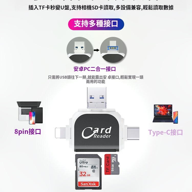半小時前多功能讀卡器適用於蘋果安卓手機 - 【優惠價】四合一多功能讀卡機 一入組 NT$788